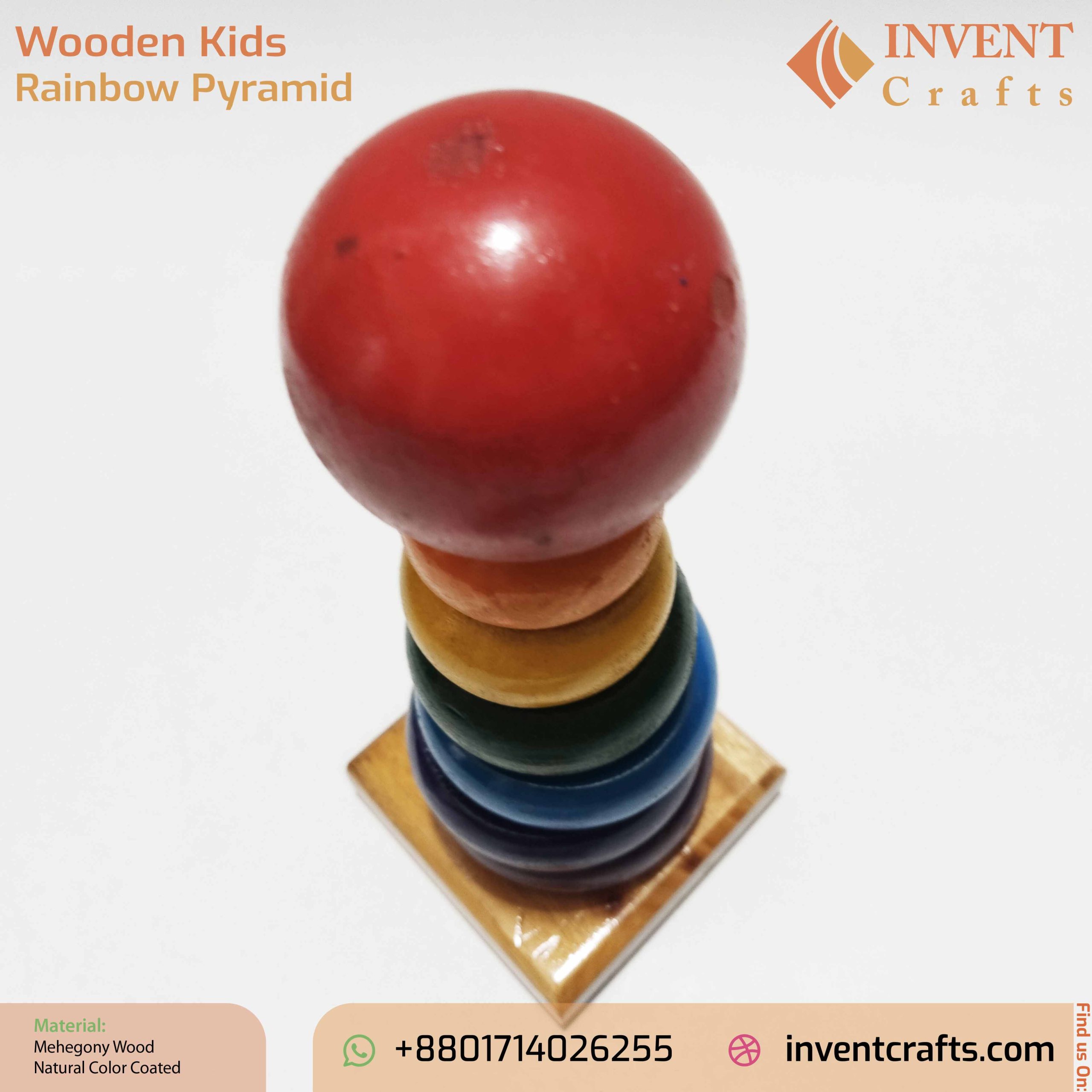 উচ্চ-মানের মেহগনি কাঠ থেকে তৈরি এবং প্রাকৃতিক রঙে কোটেড এই রেইনবো পিরামিড খেলনাটি নিরাপদ, টেকসই এবং আকর্ষণীয়। এটি বাচ্চাদের রং চিনতে, আকার বুঝতে, হাতের চোখ সমন্বয় (hand-eye coordination) উন্নত করতে এবং ফাইন মোটর স্কিলস বাড়াতে সাহায্য করে।