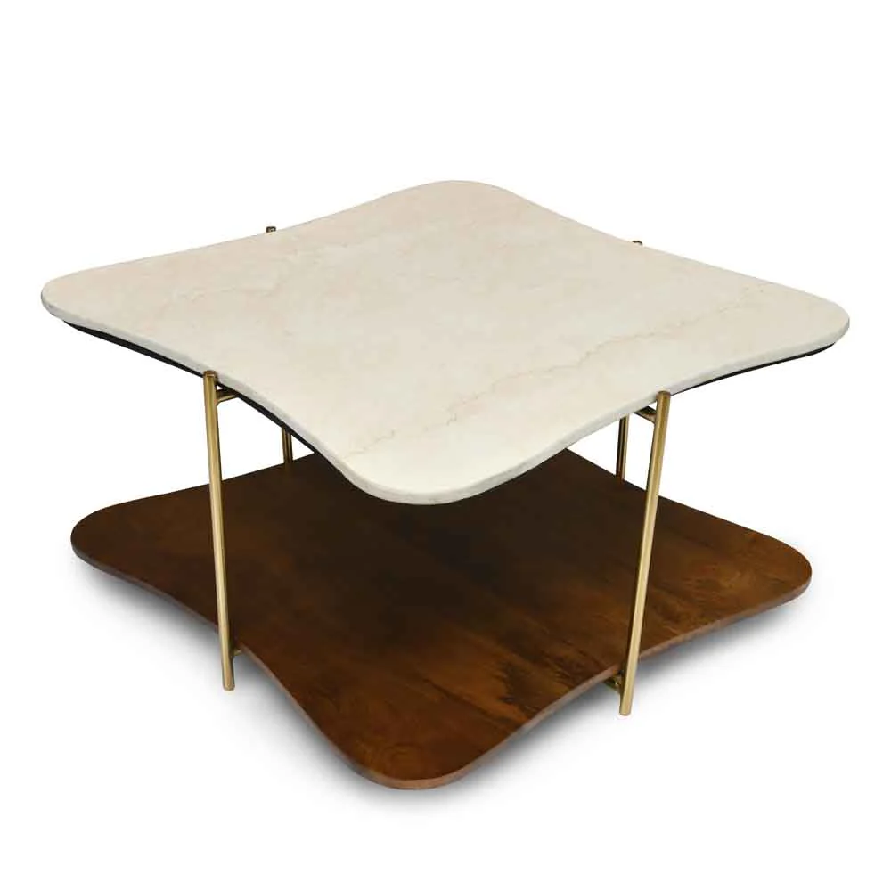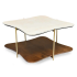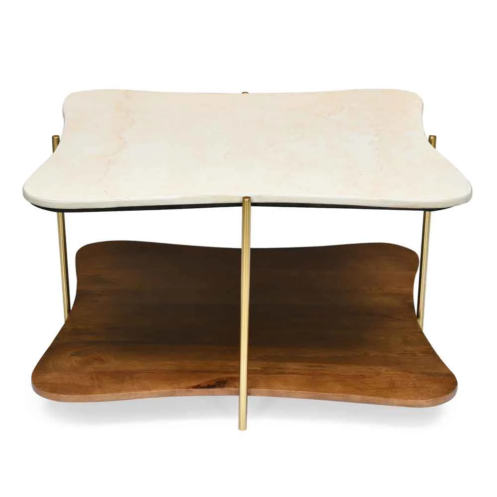 This striking mid-century modern coffee table adds a touch of retro sophistication to any living space. Featuring a clean-lined design with a smooth, white laminate top perfect for drinks and decor, it also boasts a warm walnut veneer lower shelf for added storage or display. Supported by slender, brass-tone metal legs, this two-tier table offers both functionality and timeless style. Its unique curved edges and contrasting materials create a visually appealing centerpiece that complements a variety of interior design aesthetics.